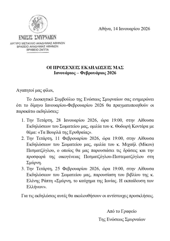 Πρόγραμμα Εκδηλώσεων Ιανουάριος – Φεβρουάριος 2026
