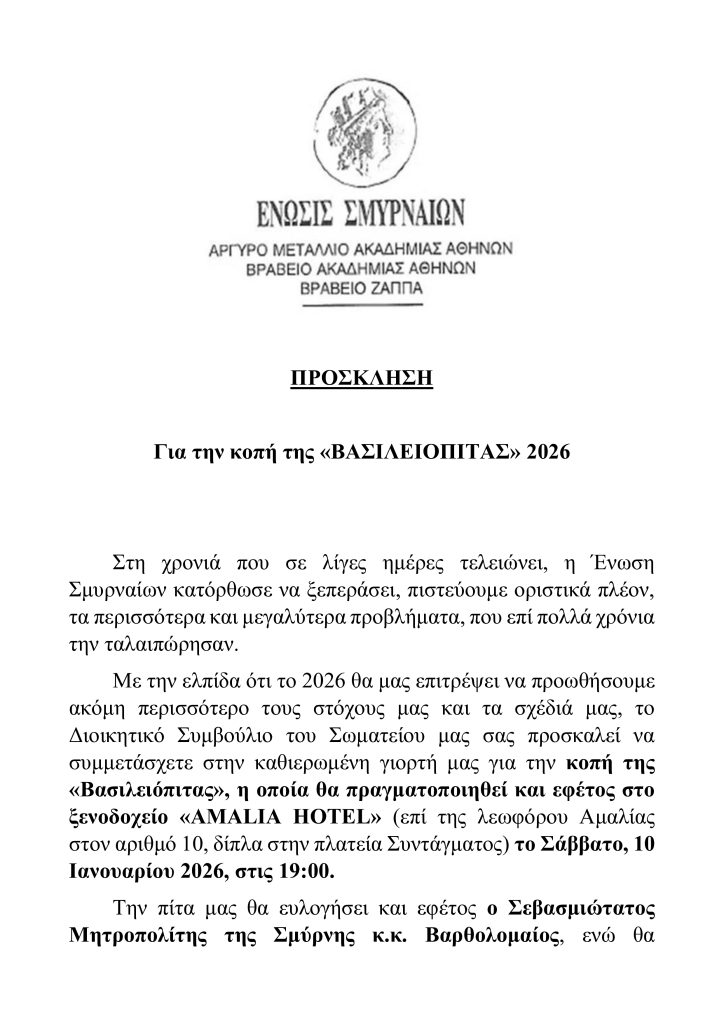 Πρόσκληση για την κοπή της “Βασιλόπιτας” 2026