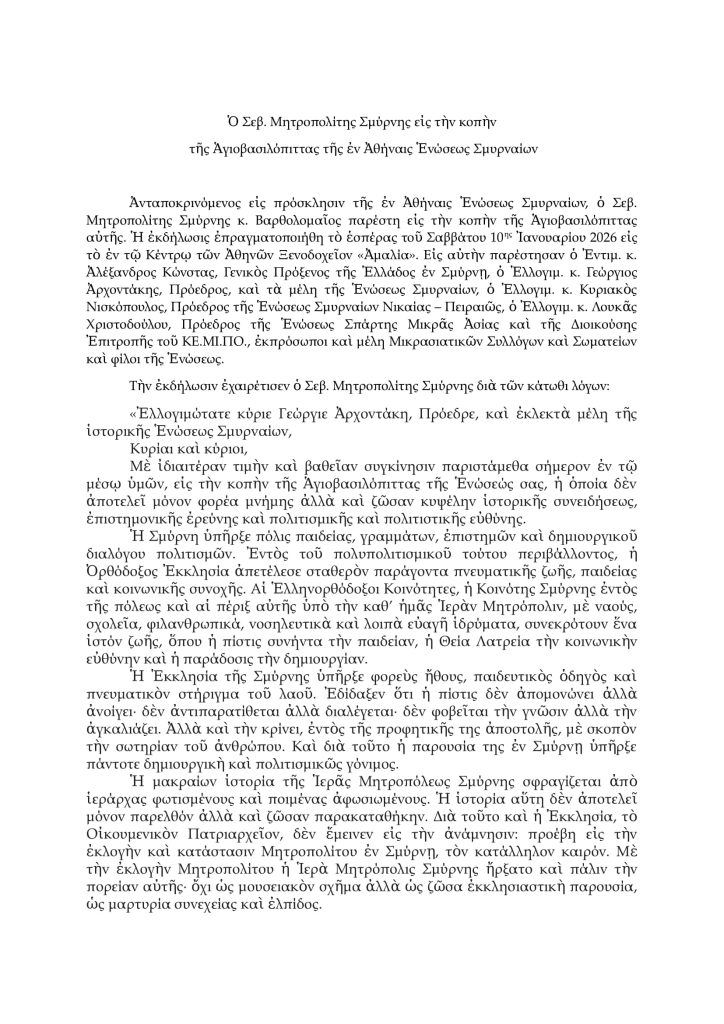 Δελτίο Τύπου από την εκδήλωση της κοπής της “Βασιλειόπιτας” της Ενώσεως Σμυρναίων