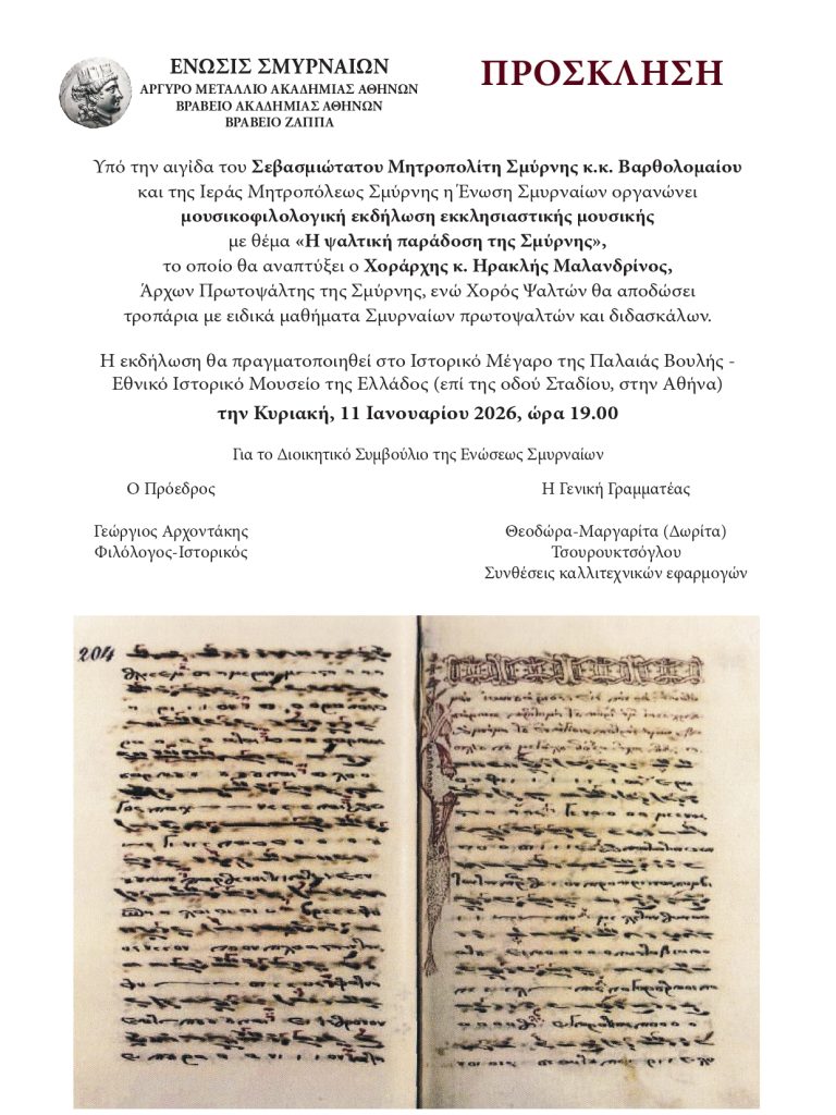 Πρόσκληση στη μουσικοφιλολογική εκδήλωση με θέμα «Η ψαλτική παράδοση της Σμύρνης»