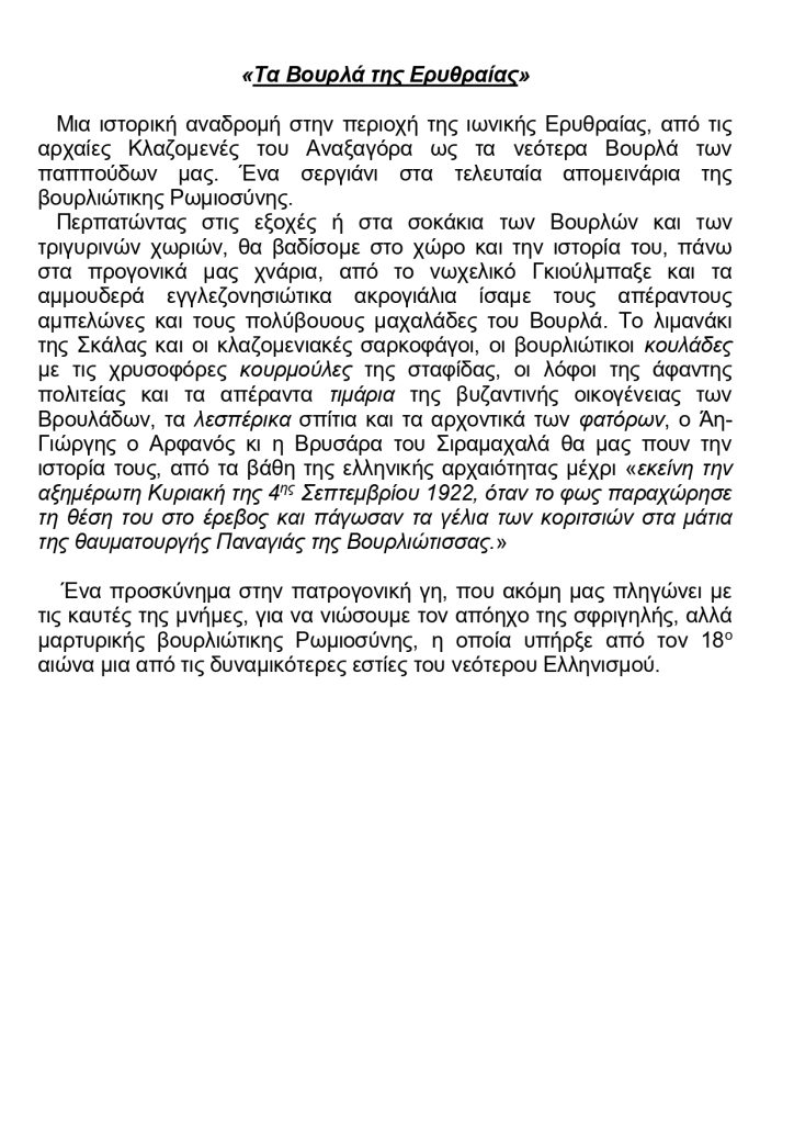 Πρόσκληση στην Εκδήλωση «τα Βούρλα της Ερυθραίας»