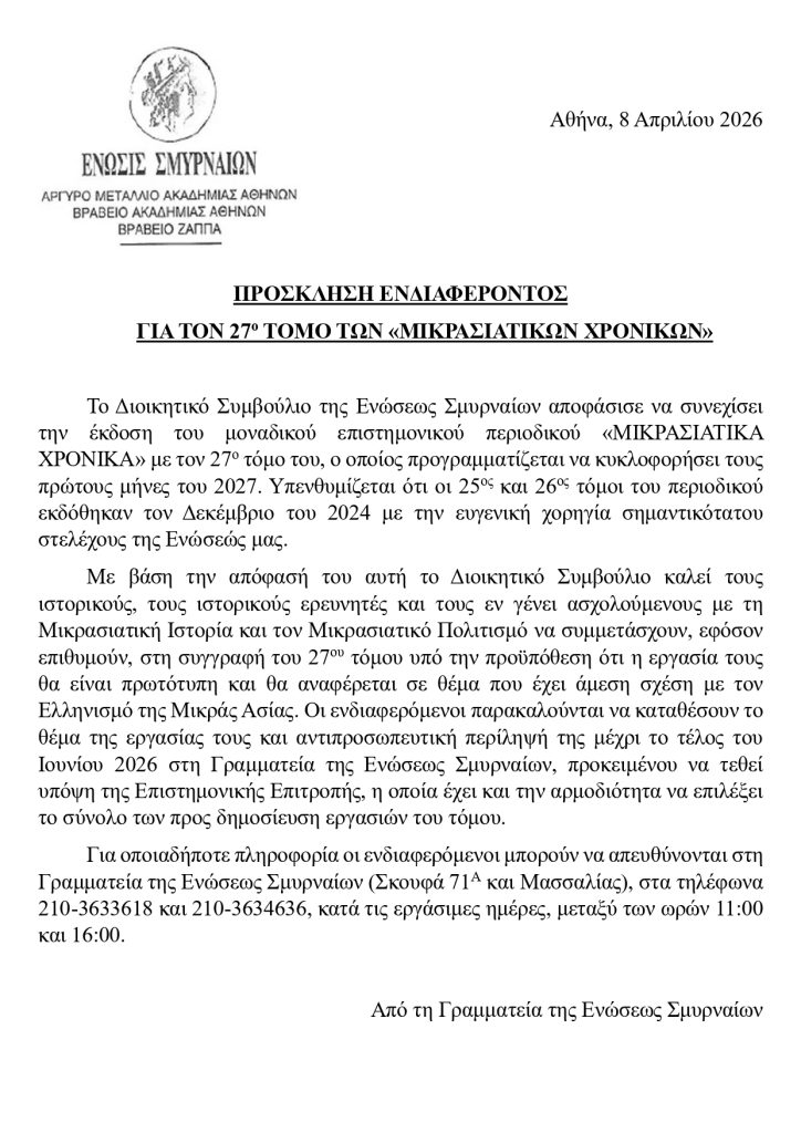 Πρόσκληση εκδήλωσης ενδιαφέροντος για τον 27ο Τόμο των Μικρασιατικών Χρονικών